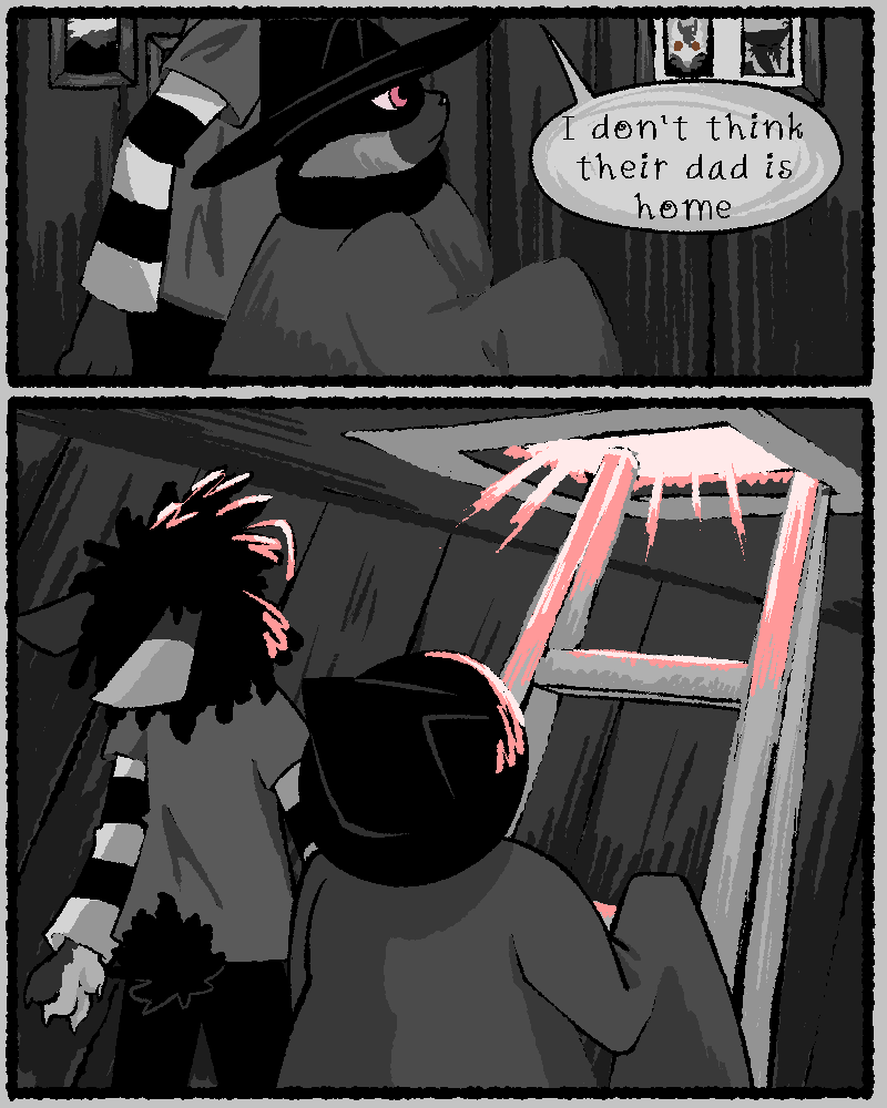 Not huge on the fact that this page and the last have the exact same formatting (long & flat panel on top, larger panel on bottom) but I didn't know how to change that without ruining the pacing. Onto more important things, behind the two characters in the top panel is a few picture frames. My favorite ended up getting covered up but I simply can't leave it in obscurity so here it is in all its glory
